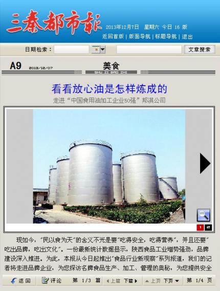 現(xiàn)如今,"民以食為天"的含義不光是要"吃得安全,吃得營養(yǎng)",并且還要"吃出品牌,吃出文化"。一份最新統(tǒng)計(jì)數(shù)據(jù)顯示,陜西食品工業(yè)增勢(shì)強(qiáng)勁,品牌建設(shè)深入推進(jìn)。為此,本報(bào)從今日起推出"食品行業(yè)新觀察"系列報(bào)道,我們的記者將走進(jìn)品牌企業(yè),為您探訪名牌食品生產(chǎn)、加工、管理的奧秘,為您提供安全消費(fèi)、放心消費(fèi)、健康消費(fèi)、時(shí)尚消費(fèi)指南。今日首期推出來自西安邦淇制油科技有限公司和多美滋嬰幼兒食品有限公司的報(bào)道。