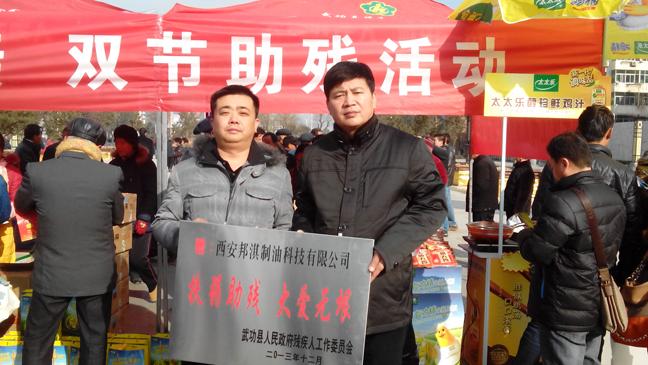 為表達(dá)石羊“邦淇人”對(duì)武功2.8萬殘疾人的關(guān)愛之情,元月1日到3日,邦淇小包總公司聯(lián)合武功縣殘疾人聯(lián)合會(huì)、陜通配送中心在縣中心廣場(chǎng)聯(lián)合舉辦“扶弱助殘獻(xiàn)愛心、饋贈(zèng)武功眾鄉(xiāng)親”活動(dòng),此次活動(dòng)得到了油脂事業(yè)部王曉勇副總經(jīng)理的大力支持,公司提供邦淇1.8L一豆300余桶、價(jià)值5000元,現(xiàn)場(chǎng)給重度殘疾人代表免費(fèi)發(fā)放。武功殘聯(lián)理事長秦喜、邦淇小包西區(qū)總經(jīng)理張帆、陜通配送中心經(jīng)理何凱及市場(chǎng)部有關(guān)人員共同參加。張總代表公司發(fā)表了熱情洋溢致辭,他首先感謝武功父老長期對(duì)“邦淇”的支持,然后簡(jiǎn)要介紹了集團(tuán)及油脂產(chǎn)業(yè)的基本情況,最后表達(dá)了對(duì)武功殘疾人朋友的深切關(guān)愛,博得了現(xiàn)場(chǎng)群眾的由衷稱贊。在熱烈的掌聲中,殘聯(lián)領(lǐng)導(dǎo)將一面寫有“扶弱助殘、大愛無垠”的銅牌授予邦淇公司。