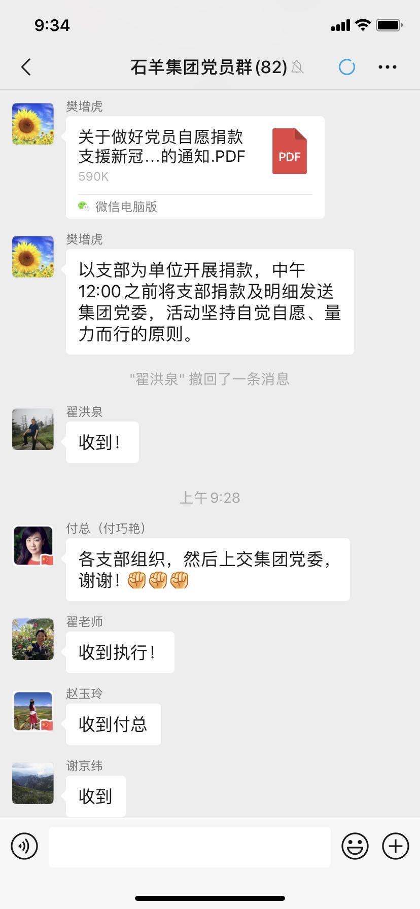 疫情就是命令,防控就是責(zé)任。危難時刻,共產(chǎn)黨員就應(yīng)該沖鋒在前。2月28日上午,石羊集團黨委下發(fā)《關(guān)于做好黨員自愿捐款支援新冠疫情防控工作的通知》,通知發(fā)出后,全體黨員和入黨積極分子踴躍響應(yīng),積極行動自愿繳納這份“特殊黨費”,為疫情防控貢獻力量,踐行石羊愛心和擔(dān)當(dāng)。