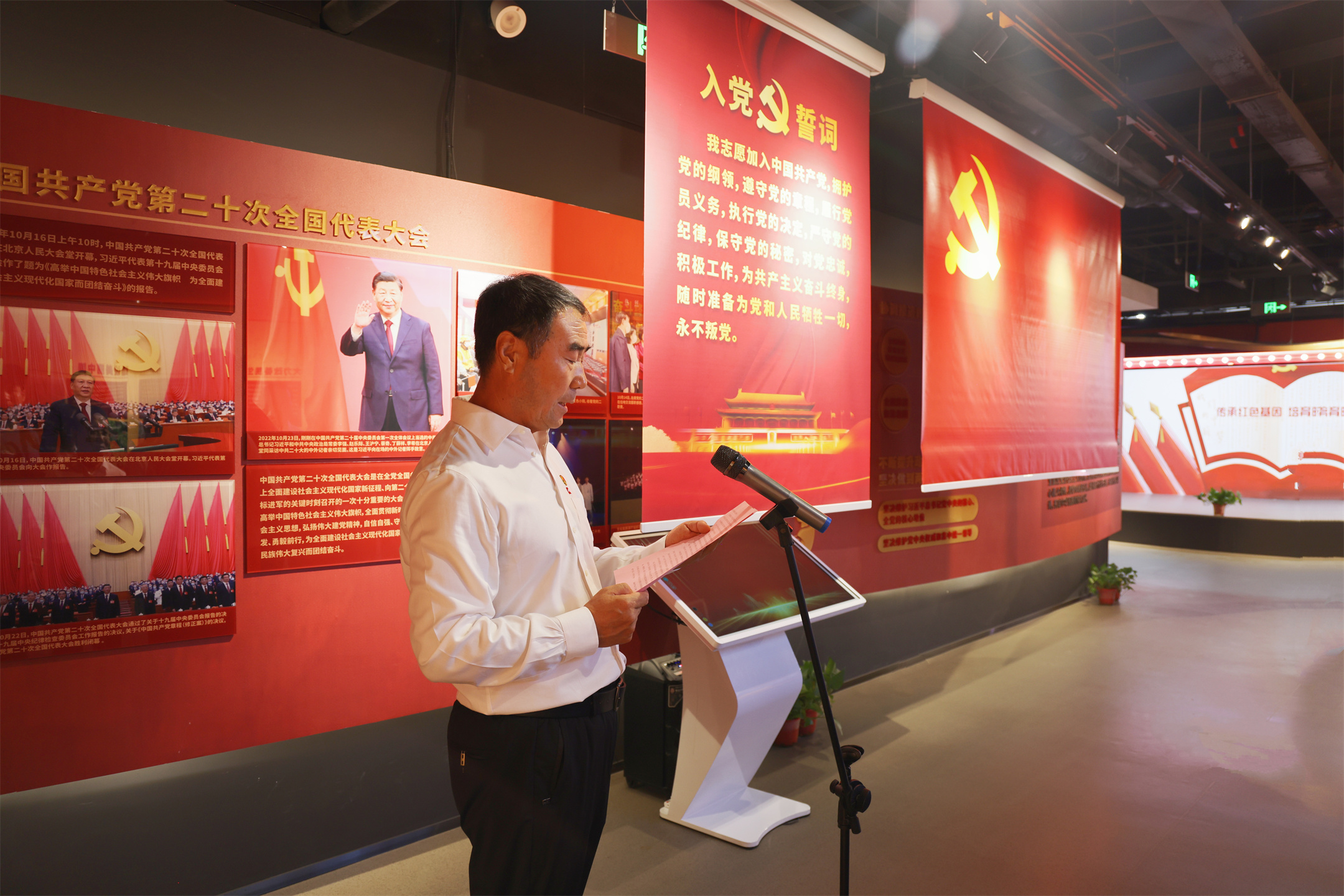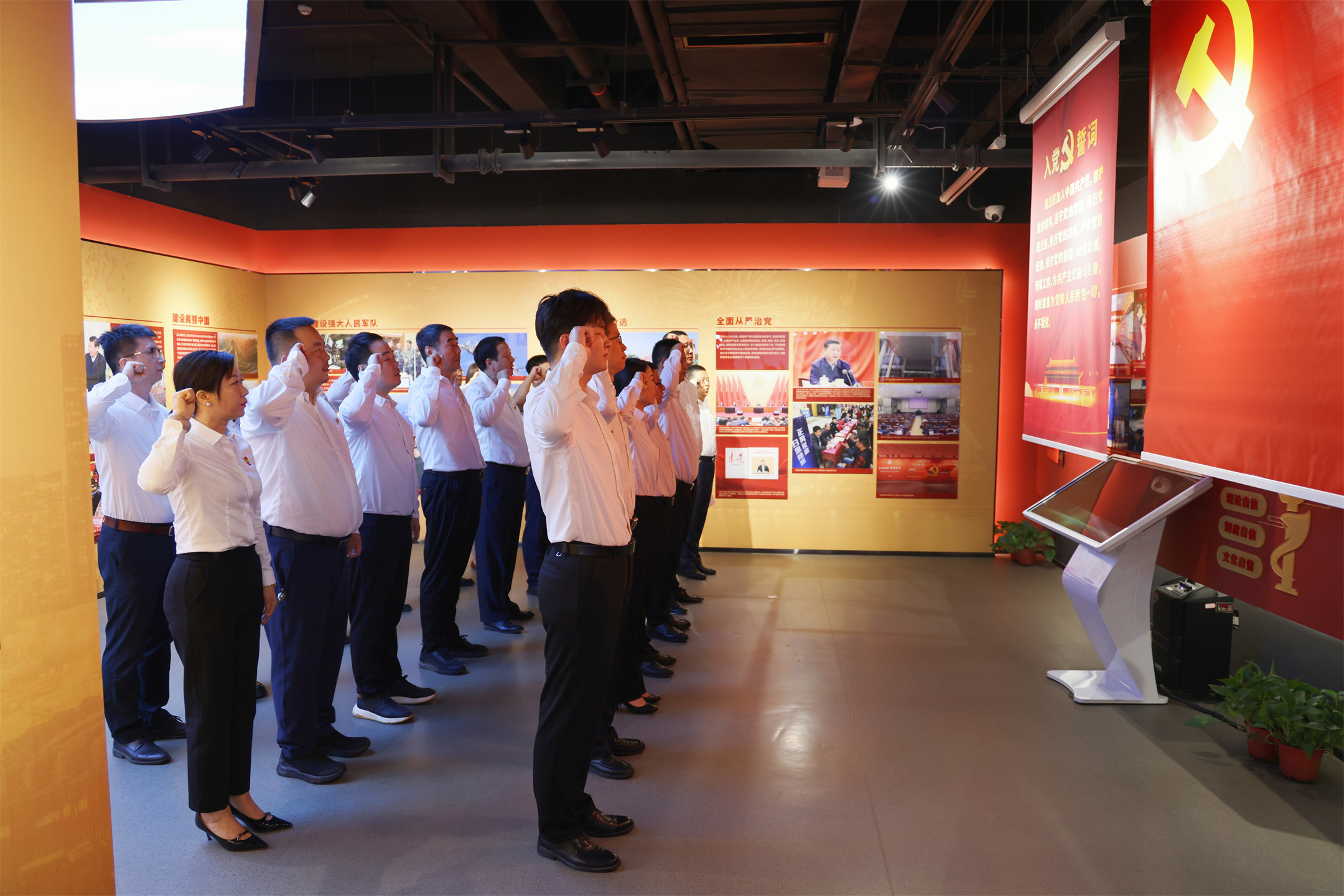 基地參觀結(jié)束后,全體黨員舉行入黨誓詞重溫儀式。“我志愿加入中國(guó)共產(chǎn)黨,擁護(hù)黨的綱領(lǐng),遵守黨的章程,履行黨員義務(wù)……”參會(huì)的全體黨員和6名預(yù)備黨員共同宣誓,鏗鏘有力的誓詞響徹整個(gè)基地。隨后舉行頌紅歌活動(dòng),全體黨員滿懷深情,用洪亮而堅(jiān)定的聲音唱響經(jīng)典紅歌《沒(méi)有共產(chǎn)黨就沒(méi)有新中國(guó)》《團(tuán)結(jié)就是力量》,那熟悉的旋律中,飽含著黨員對(duì)黨和國(guó)家的深厚感情,以及對(duì)革命先輩的崇高敬意。